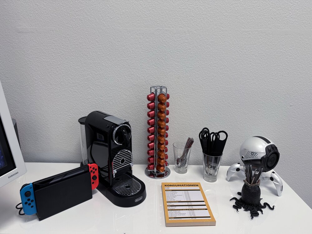 Kaffeemaschine und Kühlschrank für die nötige Verpflegung